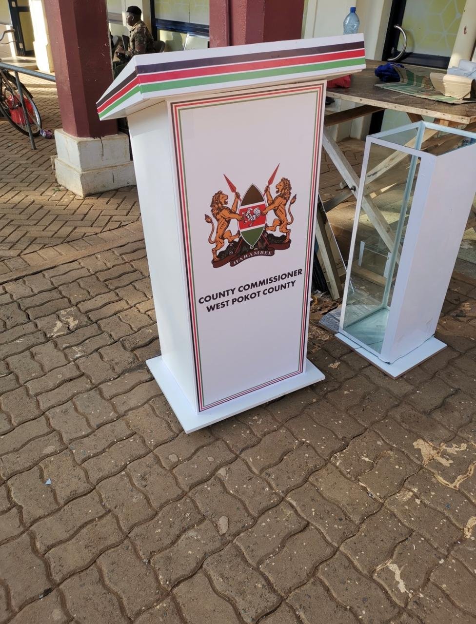 A stylish wooden lectern often branded with official logos, used in official events and formal speeches.